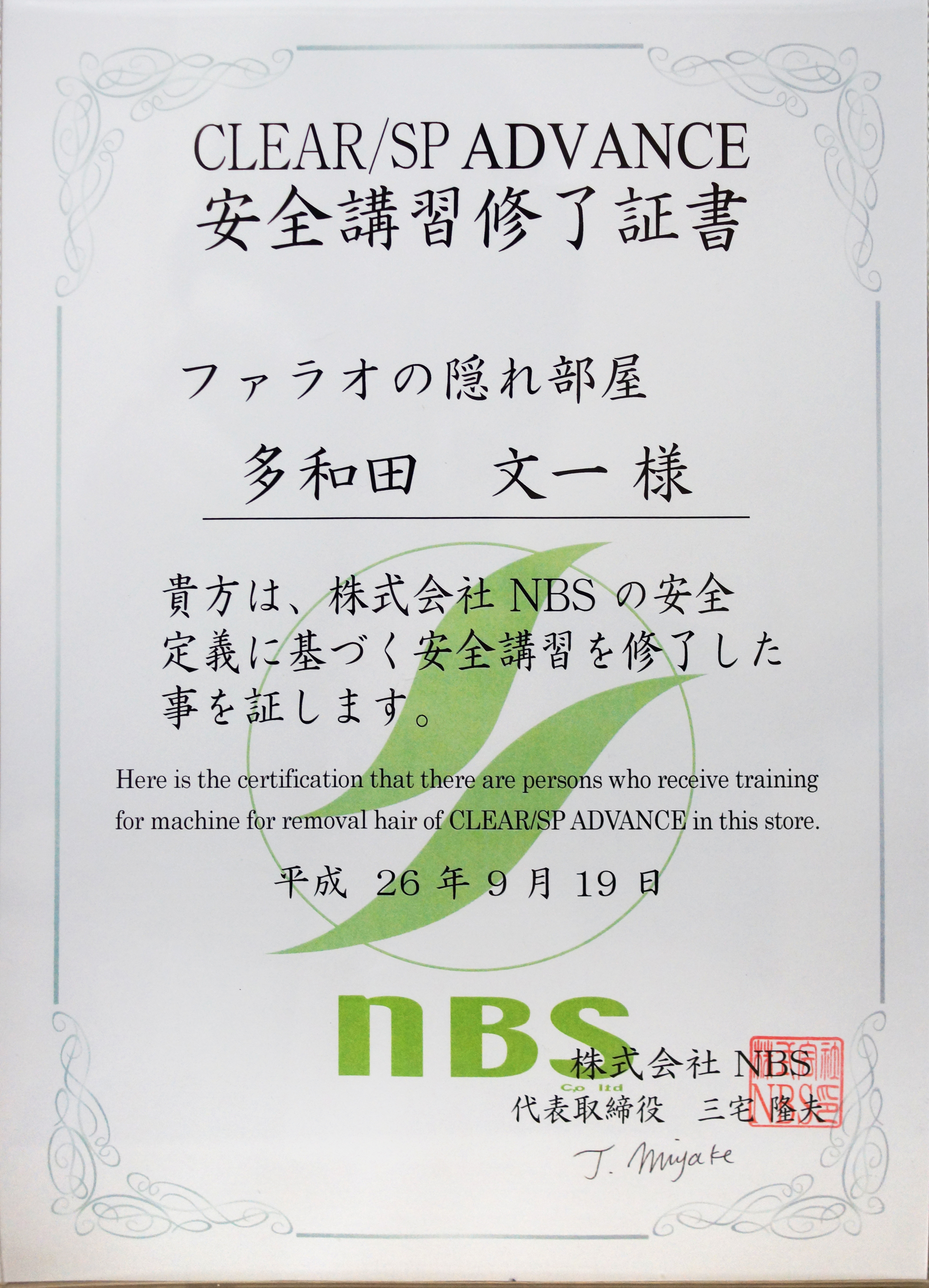CLEAR/SP ADVANCE安全講習修了証書
