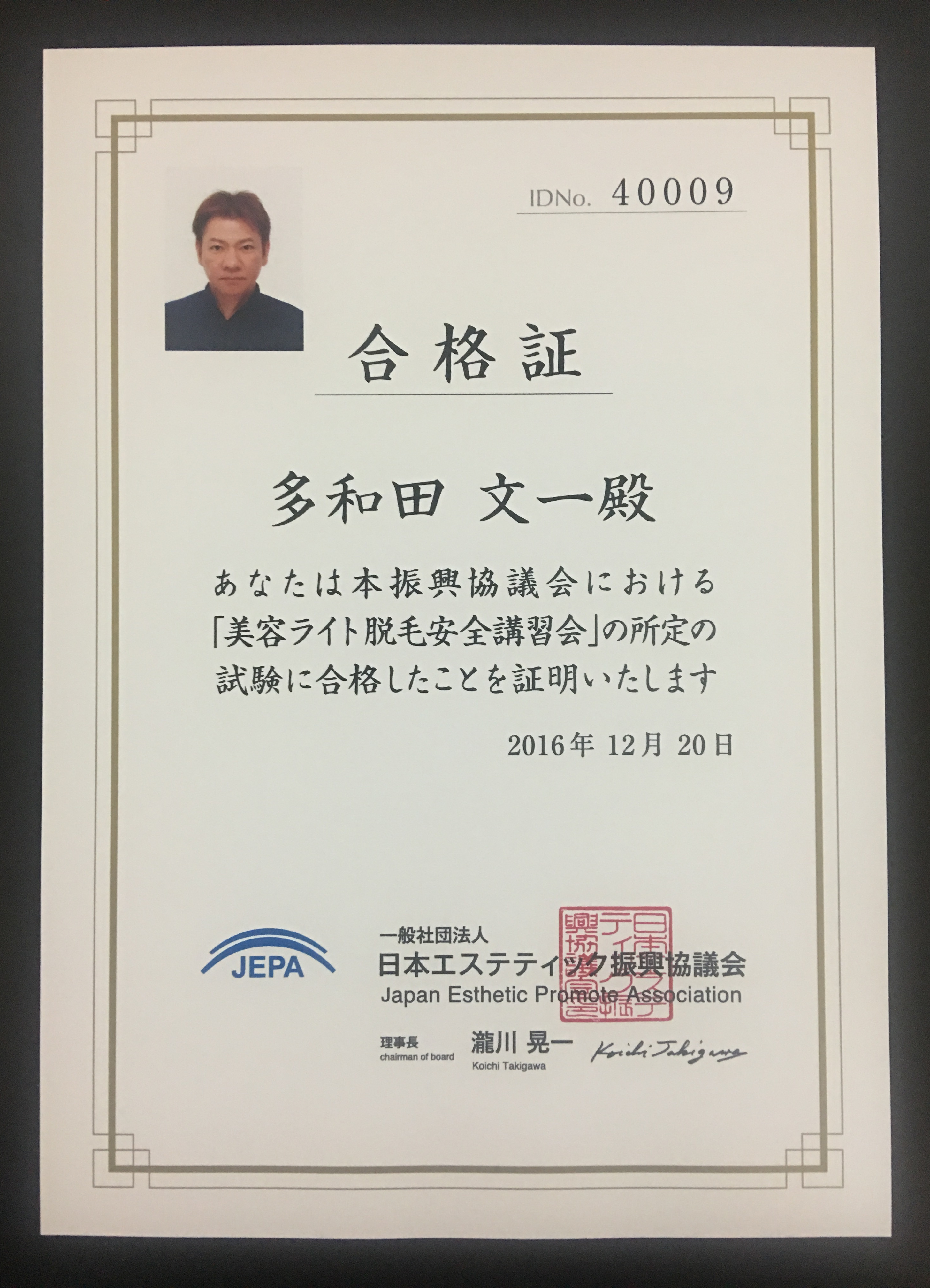 JEPA 日本エステティック振興協議会では、お客様への「安全」「安心」を確保する為の取り組みとして『美容ライト脱毛安全講習会』を実施しておりますが、本講習会における所定の試験に合格したことを証明します。