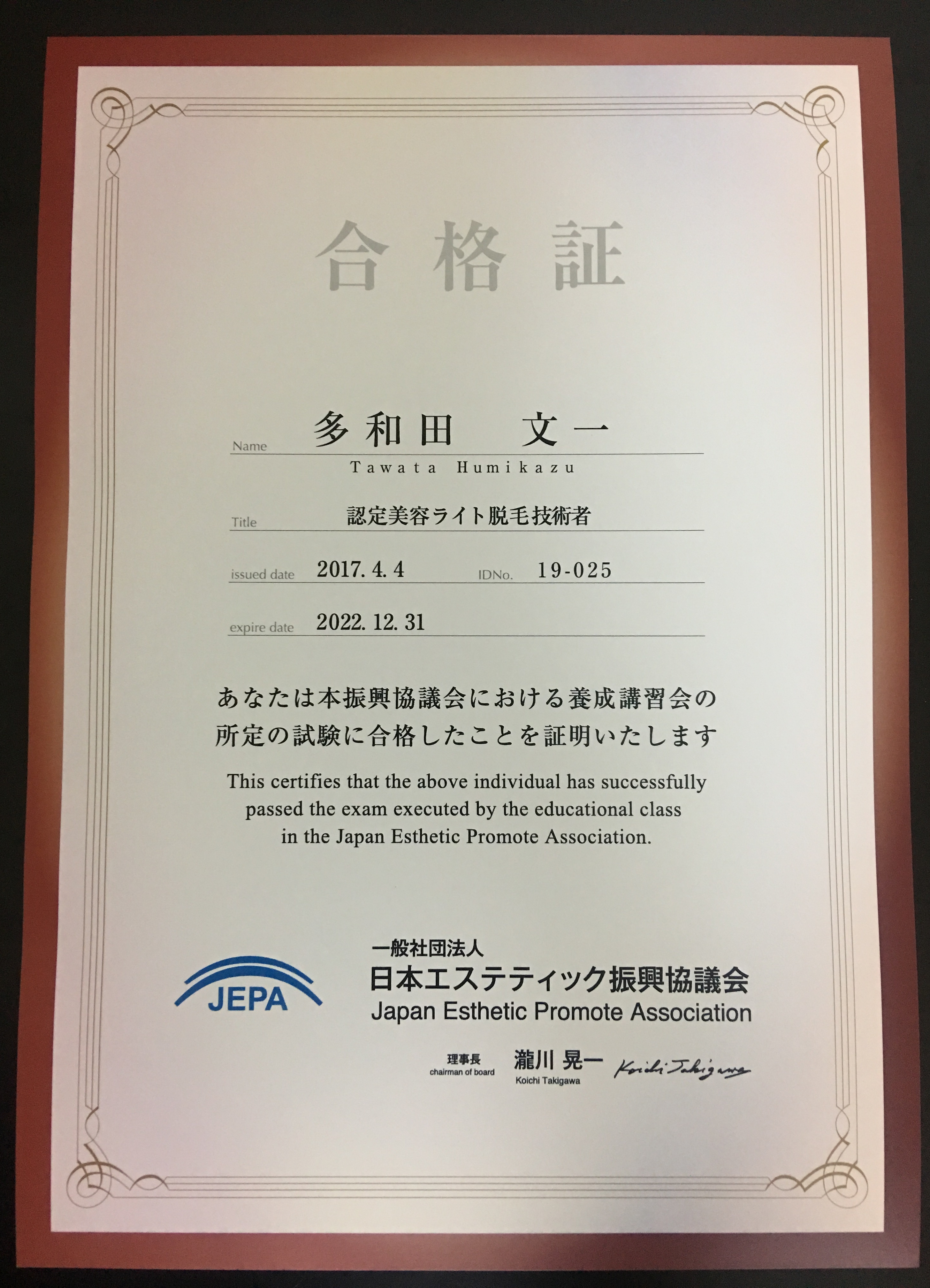 JEPA 日本エステティック振興協議会の更に、より高度な専門知識が加わった『認定美容ライト脱毛技術者講習会』における判定試験に合格したことを証明します。